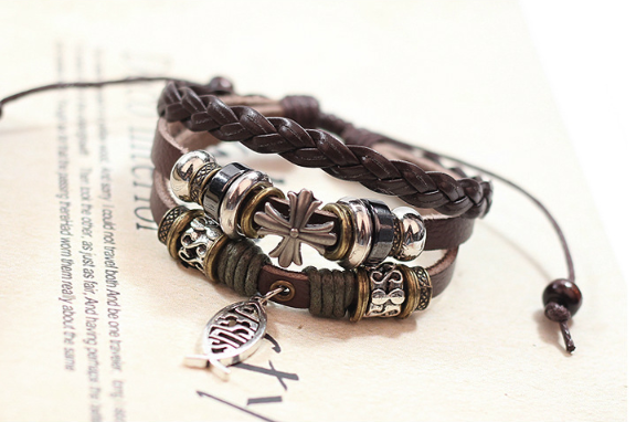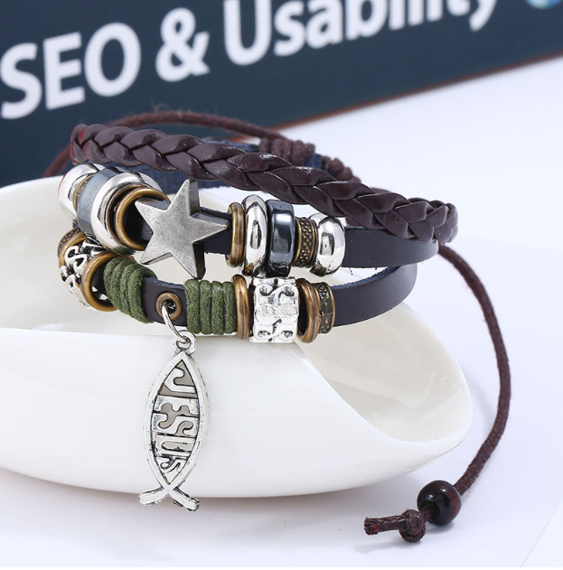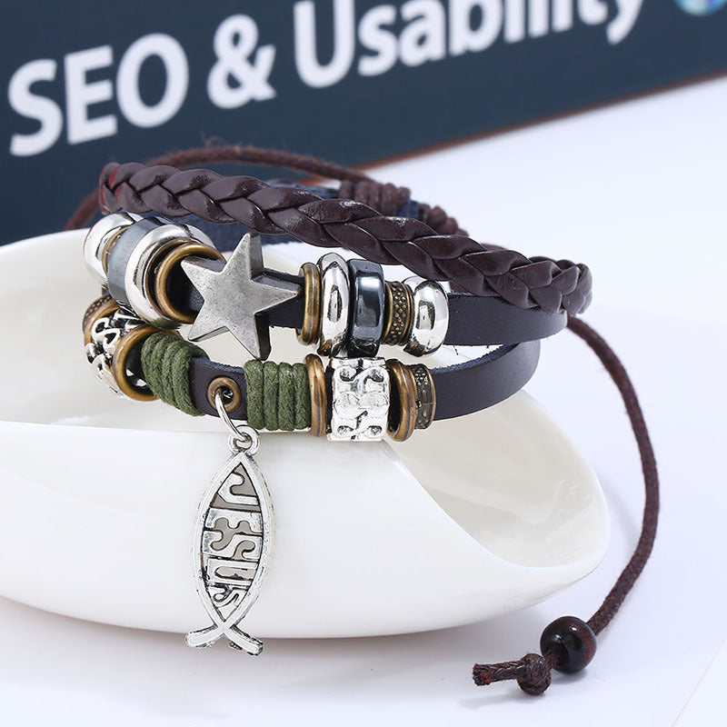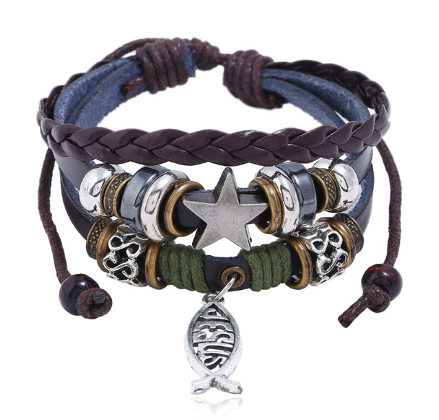 New beaded leather bracelet Jewelry wholesale Factory direct leather bracelet Jesus fish Cross bracelet